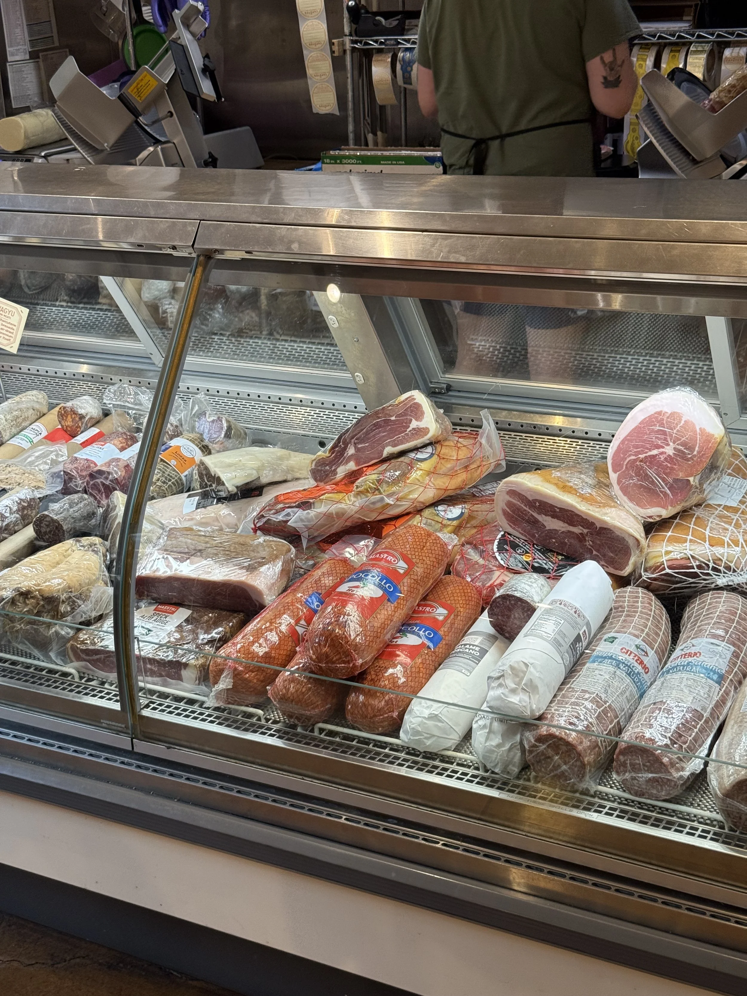 Display case filled with various cuts of meat and sausages at Caputo's in Salt Lake City, with a person standing behind the counter.